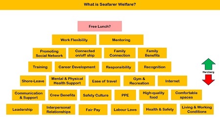 Listing seafarer welfare initiatives: The below diagram is a non-exhaustive list of crew welfare initiatives. Those at the bottom are the basic minimum and the ones on the higher levels increase value, inspired by Herzberg’s factors of motivation. More initiatives strategically implemented result in higher engagement.